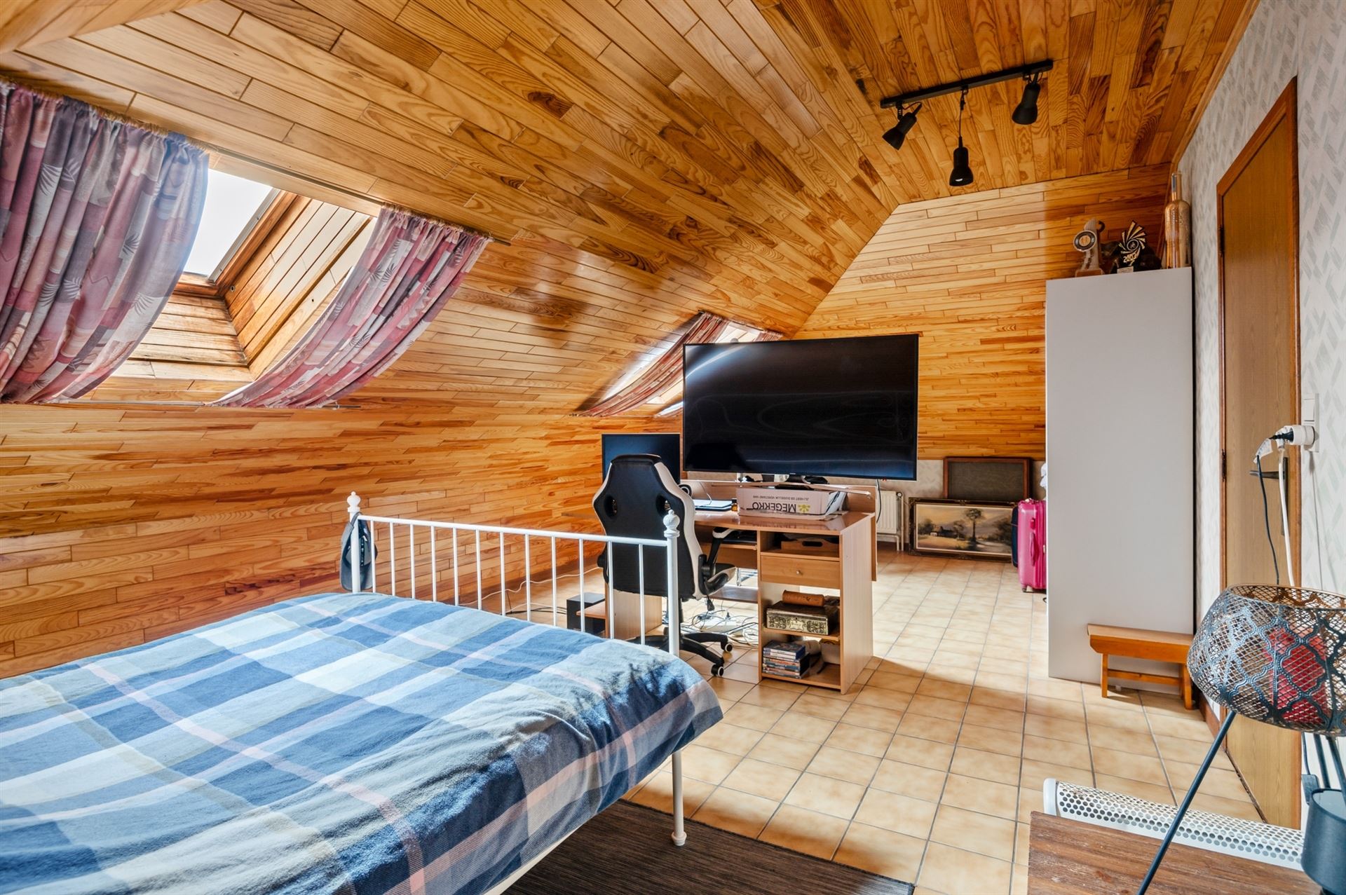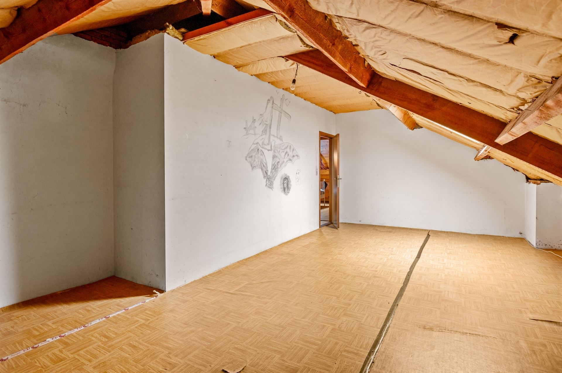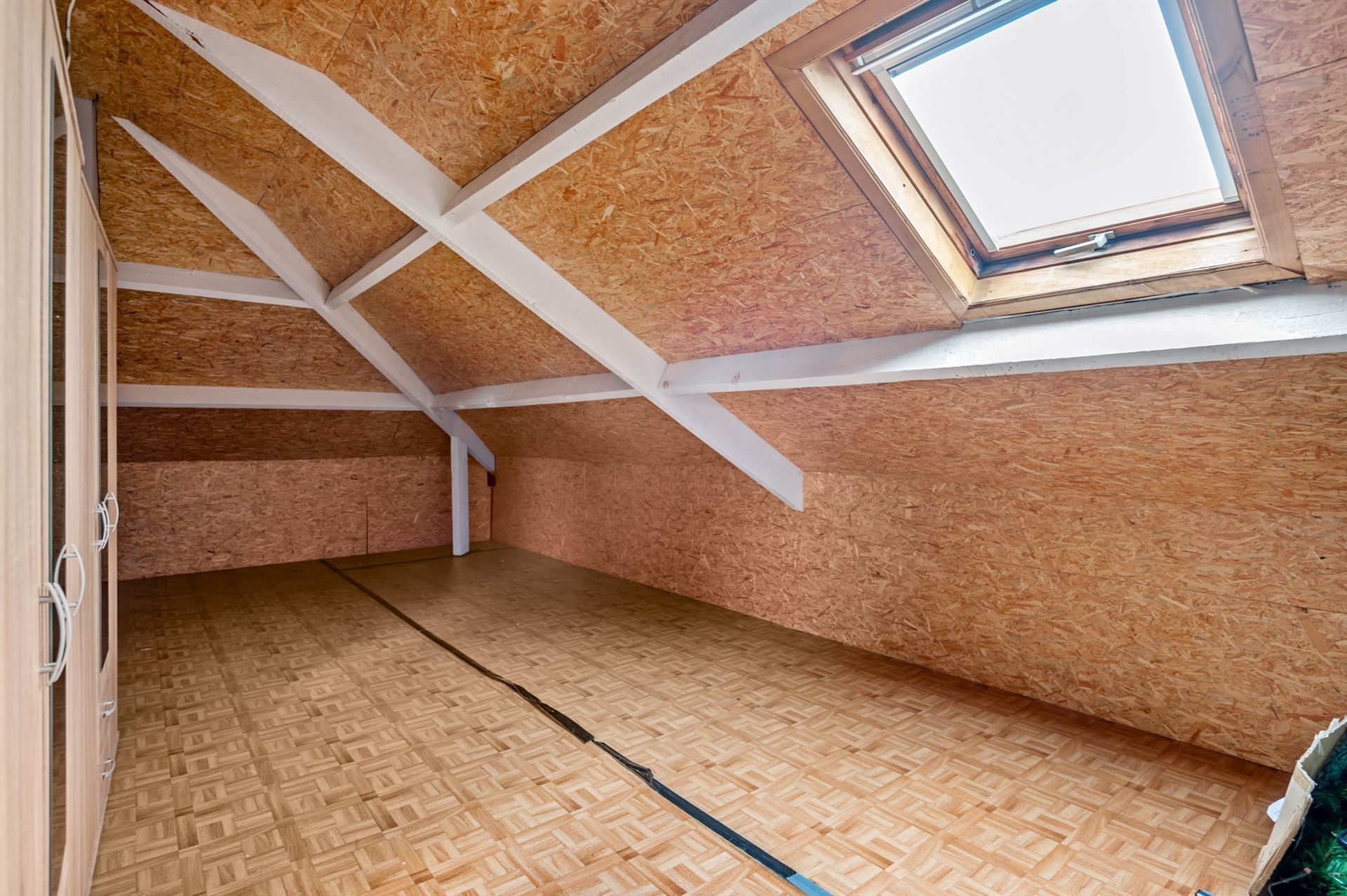 Die bovenverdieping was trouwens nooit volledig afgewerkt. In één kamer waren enkel OSB-platen tegen het dak bevestigd, in een andere hing de dakisolatie gewoon zichtbaar. Dat maakte de keuze om hier stevig in te grijpen een stuk eenvoudiger.