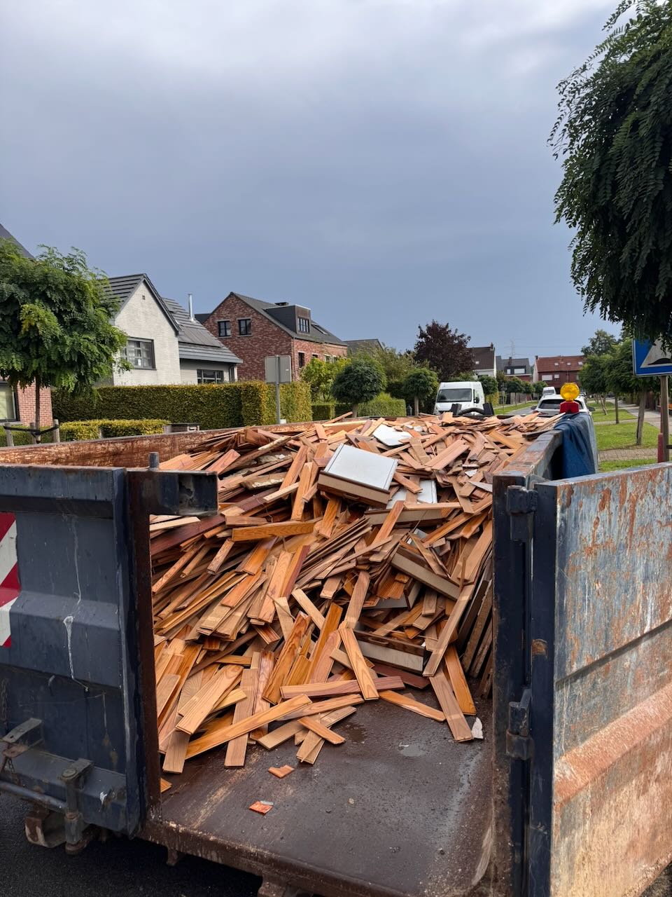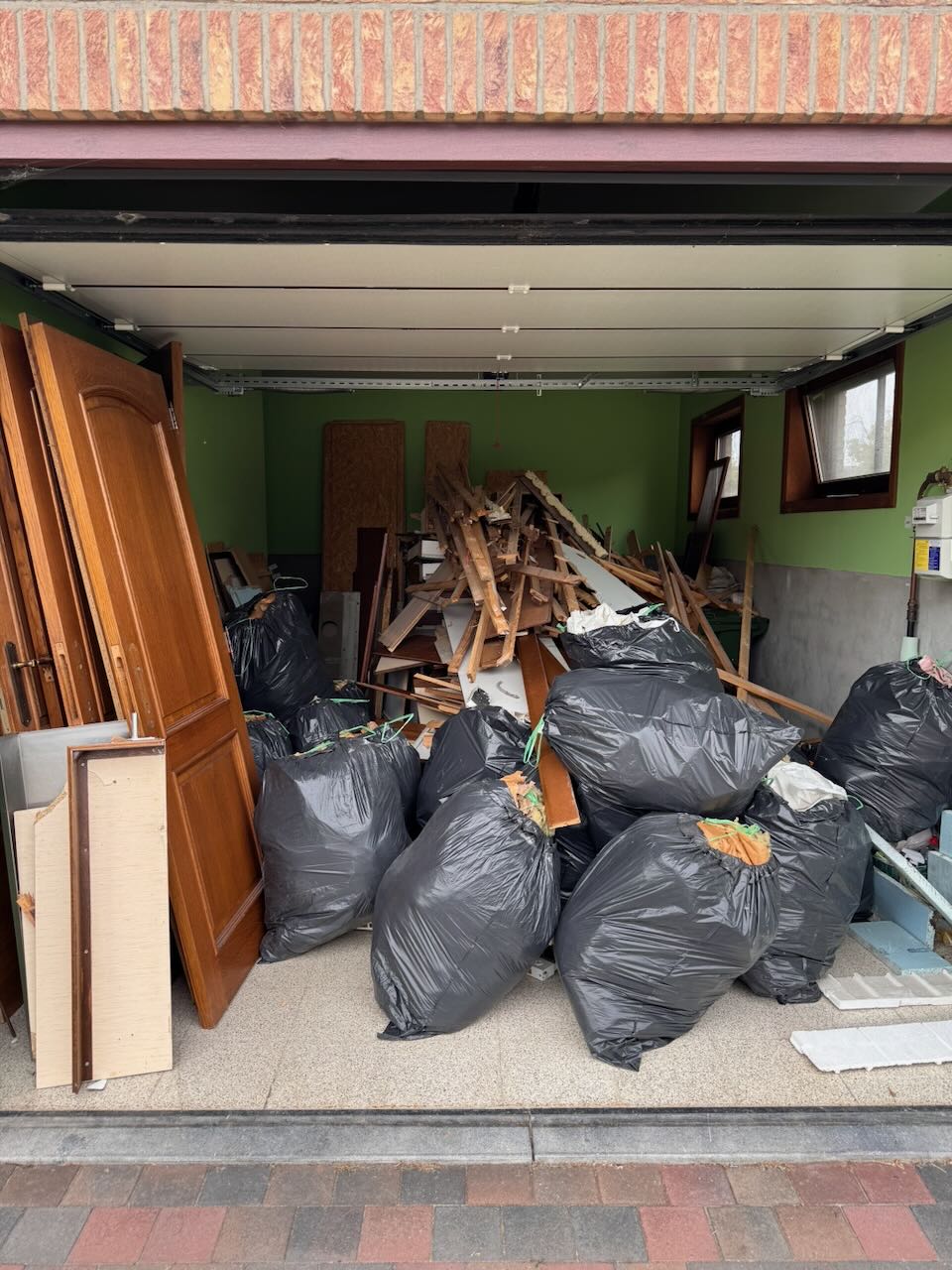 De grootste moeilijkheid bleek niet het afbreken zelf, maar het inschatten van het volume. Uiteindelijk bleek een container van 15 m³ geen overbodige luxe. Met die eerste volle container namen we meteen afscheid van een groot stuk van de “vintage” look van het huis.