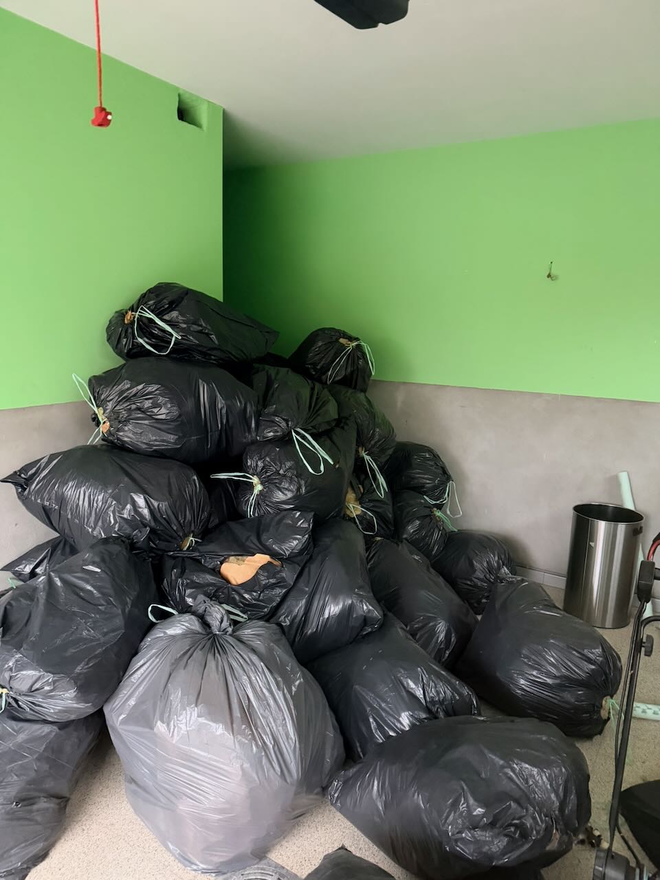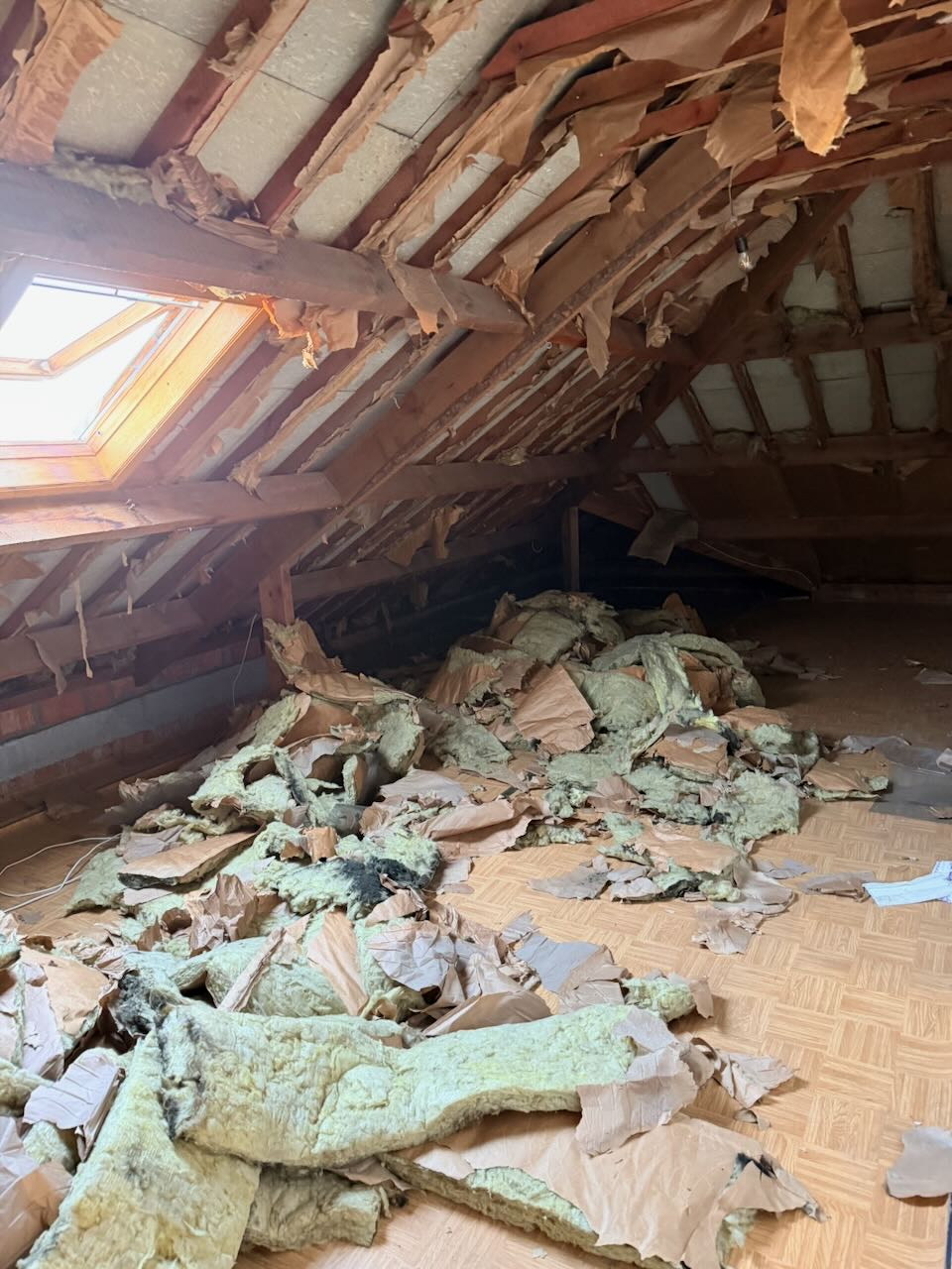 De dakisolatie werd apart in plastic zakken verpakt en zelf naar het containerpark gebracht. Het volume was groot, maar het gewicht viel goed mee. In totaal gaven we daar ongeveer 120 euro uit — een container enkel voor isolatie zou een veelvoud gekost hebben.